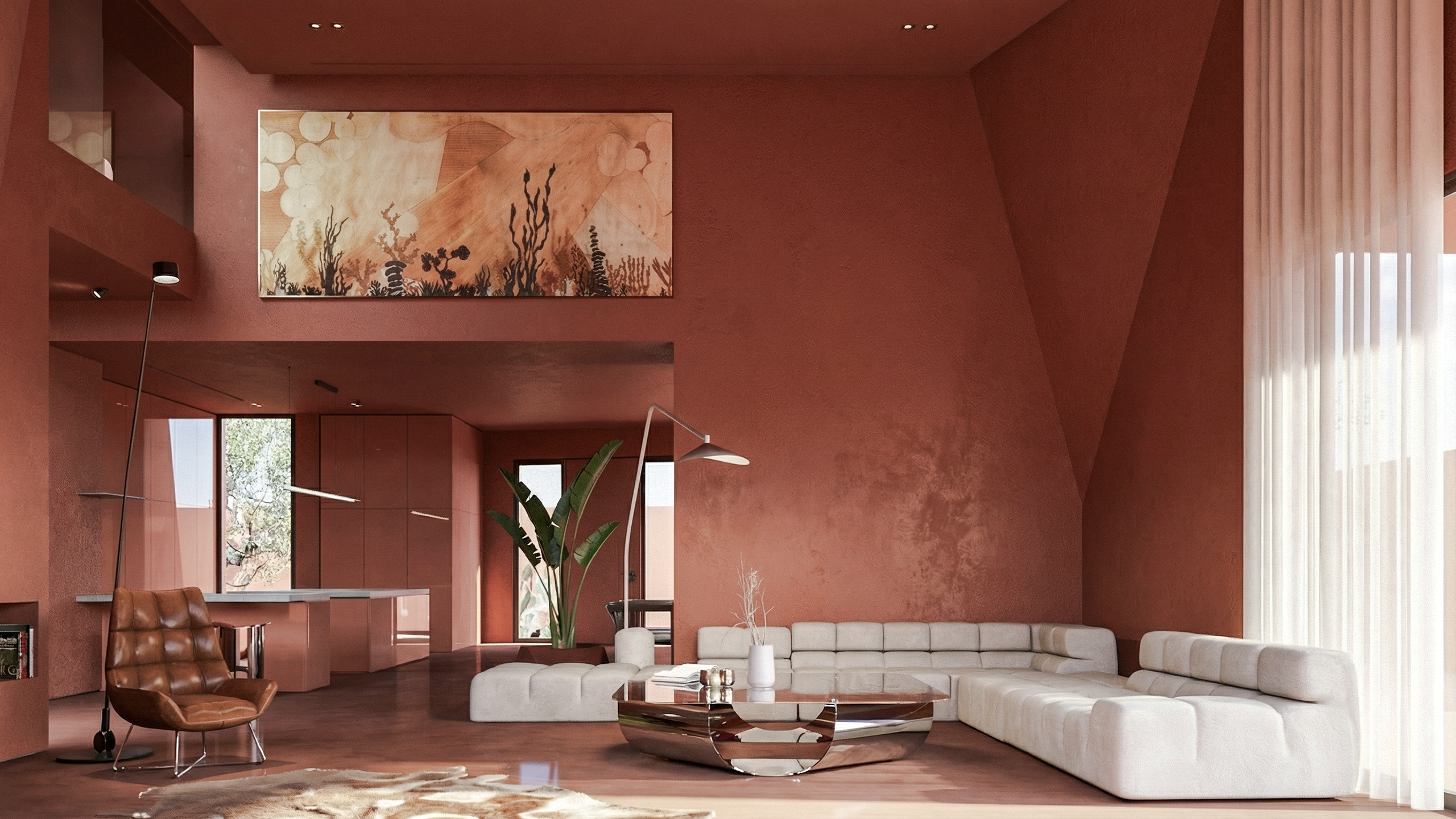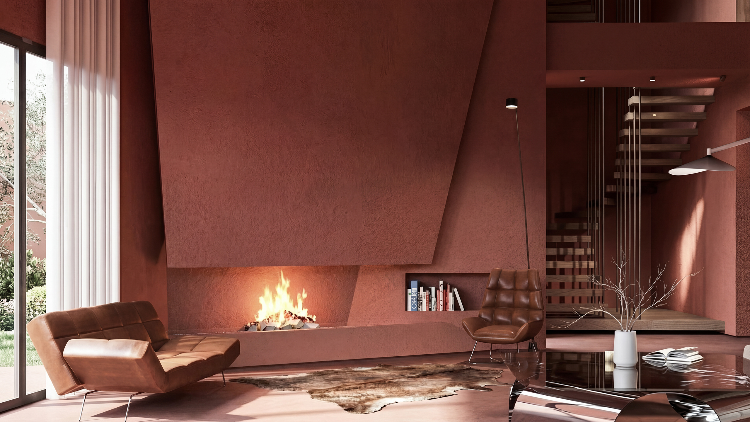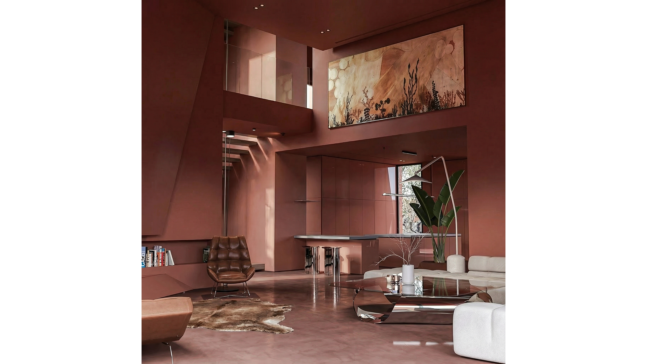 The interior design continues the exterior's sculptural narrative through a unified surface approach. Walls, floors, and ceilings are treated within the same tonal family, simplifying the reading of the geometry and strengthening spatial continuity.