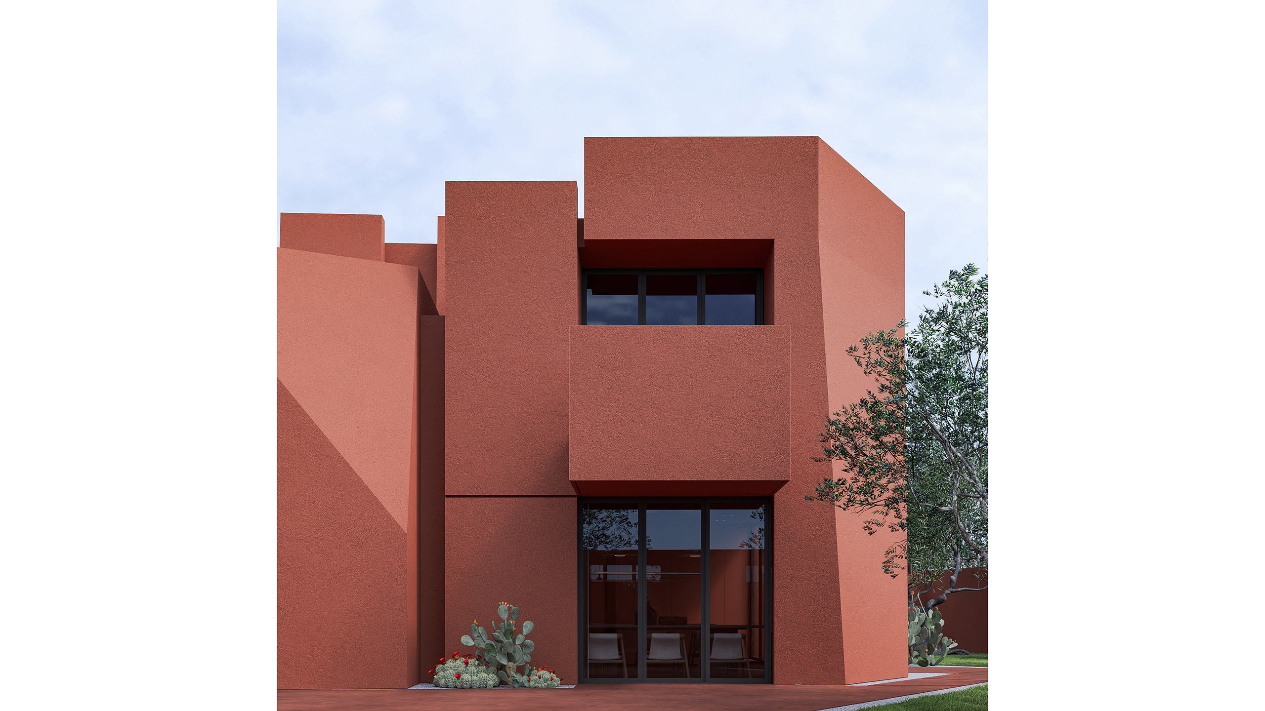 A restrained palette of monochrome earth tones emphasizes the plastic quality of the form. As daylight moves across the broken surfaces, the perception of the building continuously shifts, creating an architecture that feels alive and responsive throughout the day.