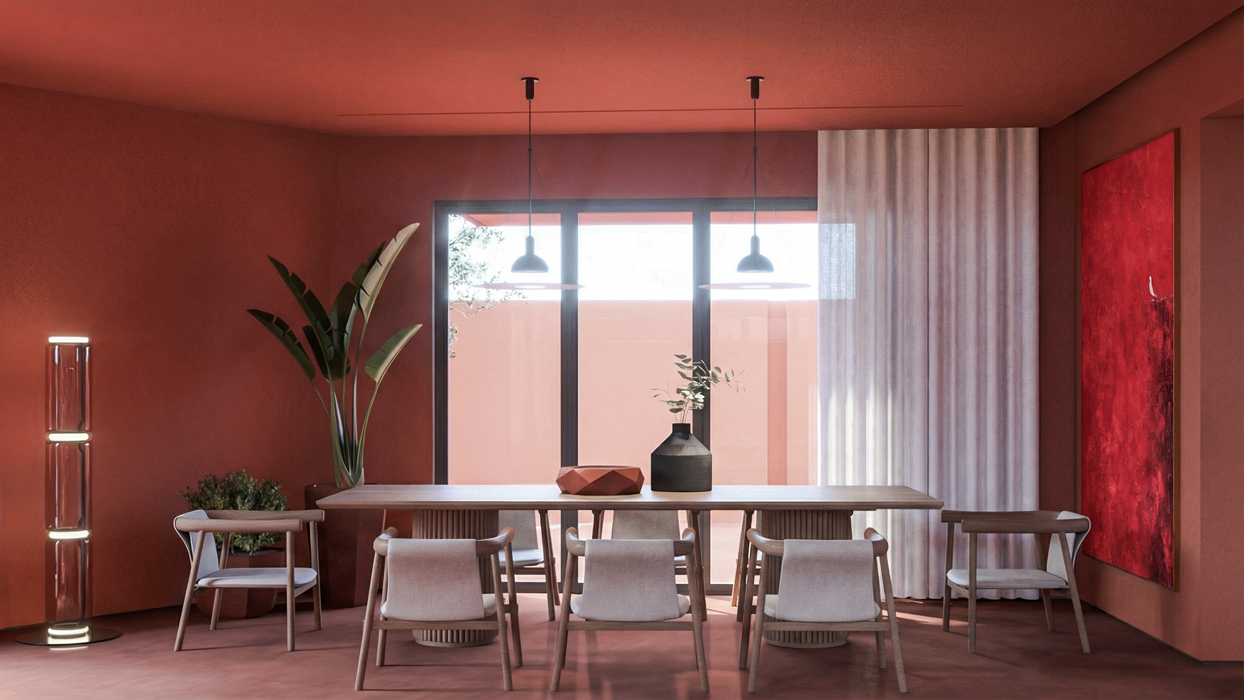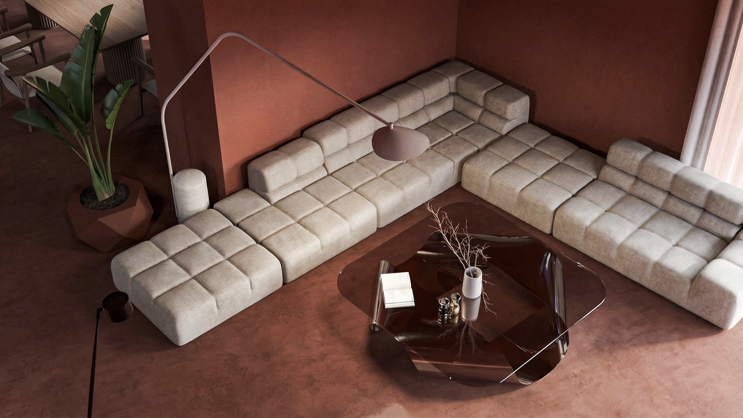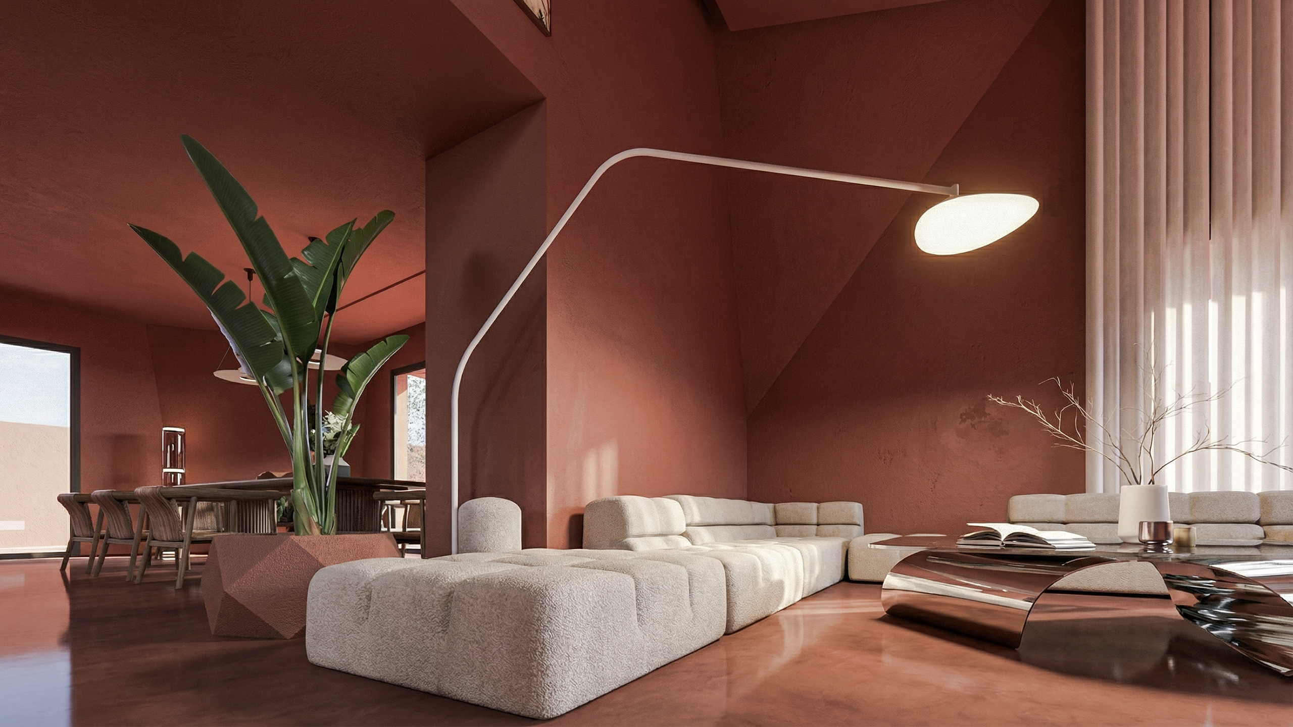 Natural light enters the villa from multiple orientations, animating surfaces and creating subtle shadow play throughout the day. These shifting light conditions reinforce the sculptural quality of the architecture while maintaining a warm and habitable atmosphere.