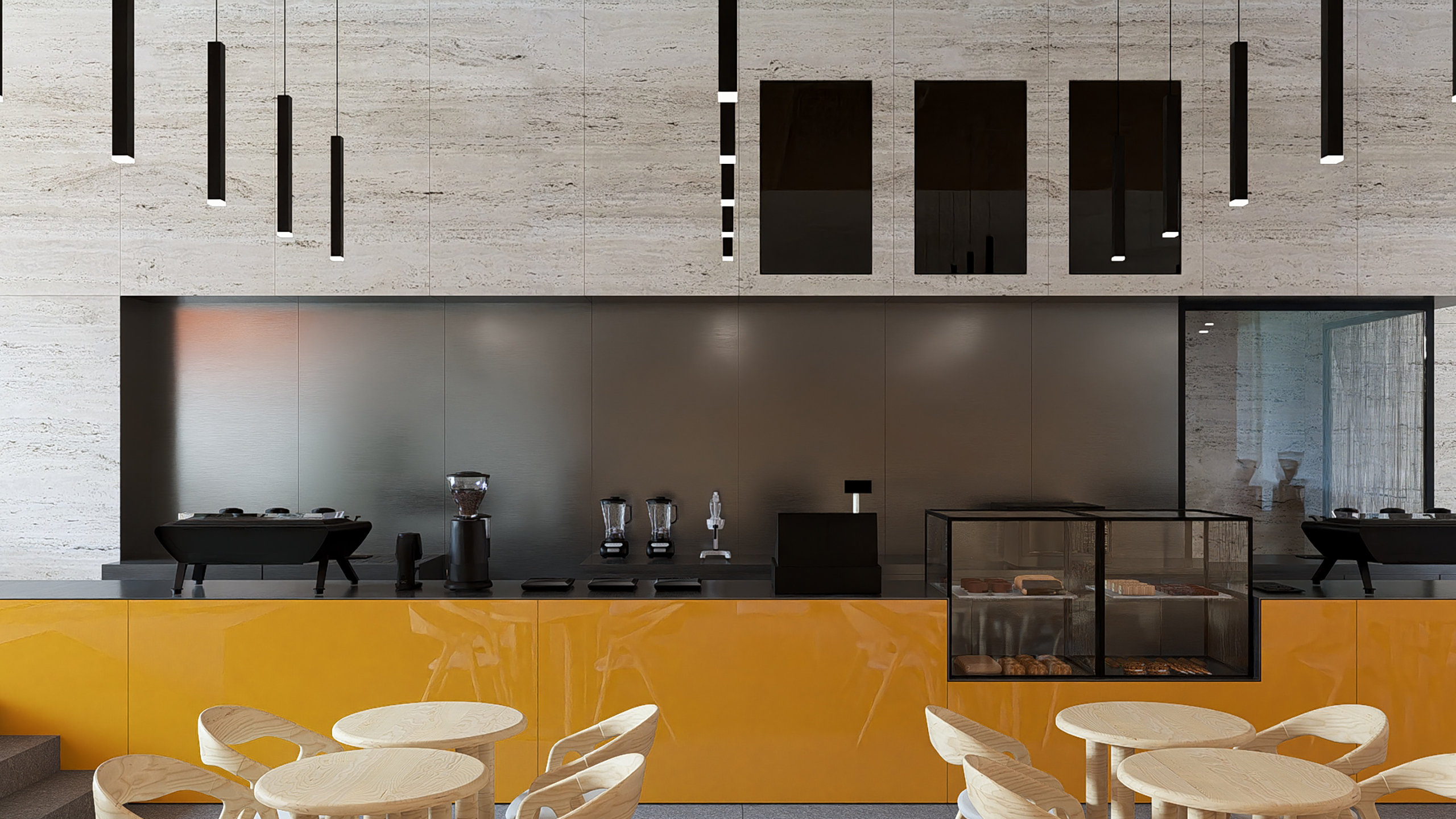 General illumination is kept soft and homogeneous, establishing a calm and comfortable baseline throughout the space. In contrast, more focused and intense lighting is applied to the counter and production areas, highlighting key moments of activity and drawing attention to the making process.