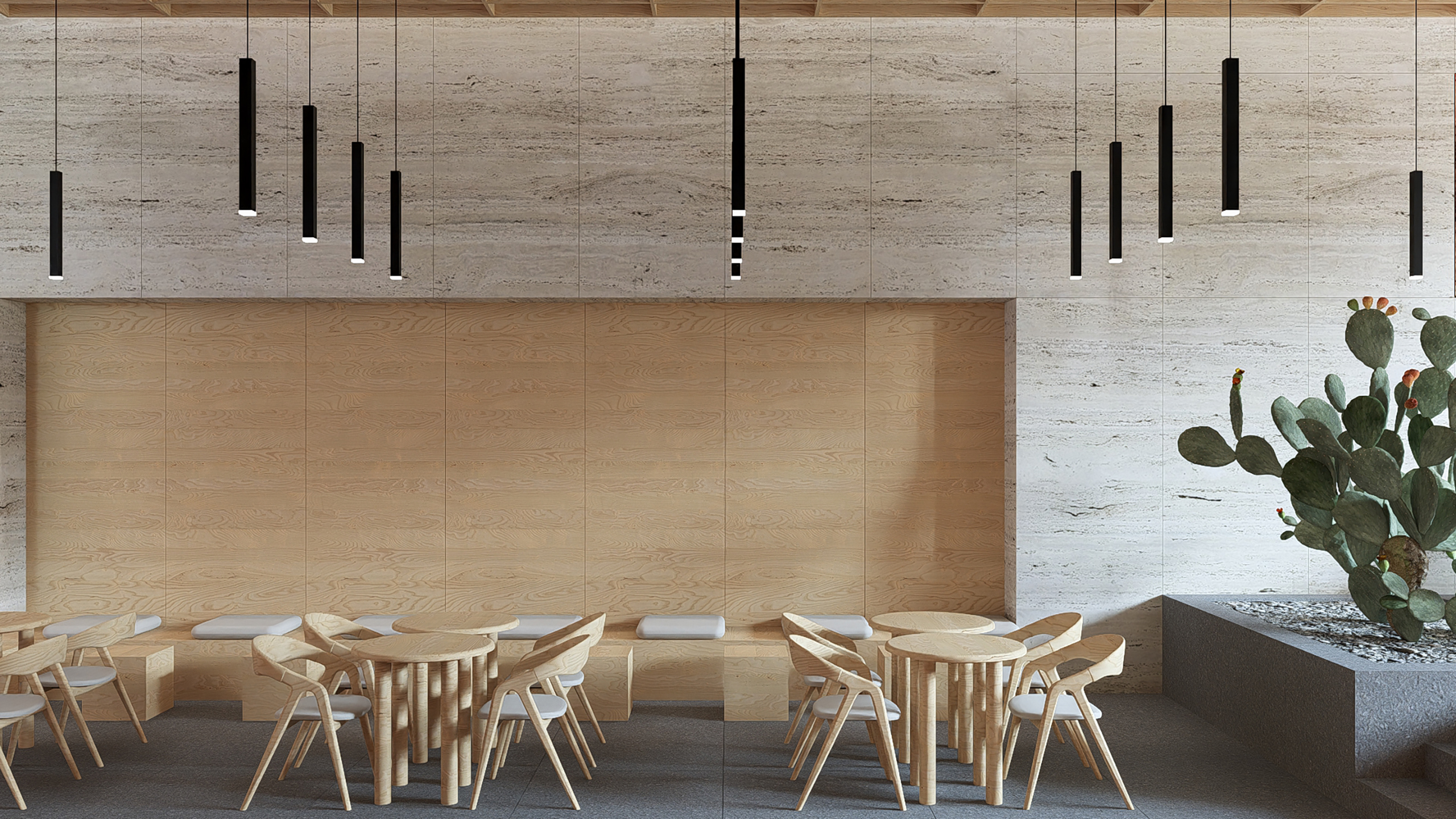 The material strategy builds upon Traum Kaffee’s established minimalist identity while introducing a richer and more tactile atmosphere. A natural and warm palette defines the space, where travertine wall surfaces and wooden furniture elements create a calm, balanced environment.