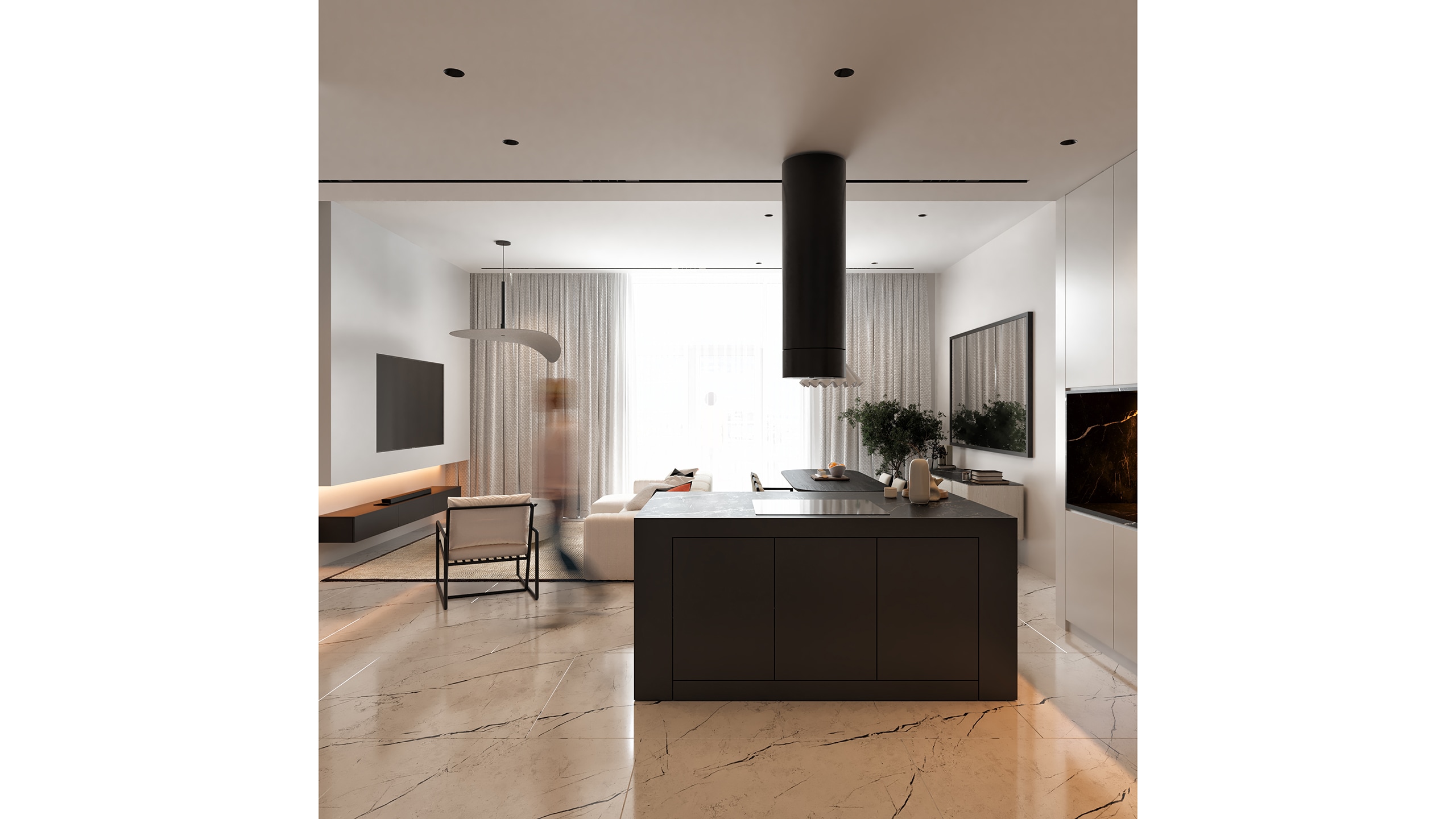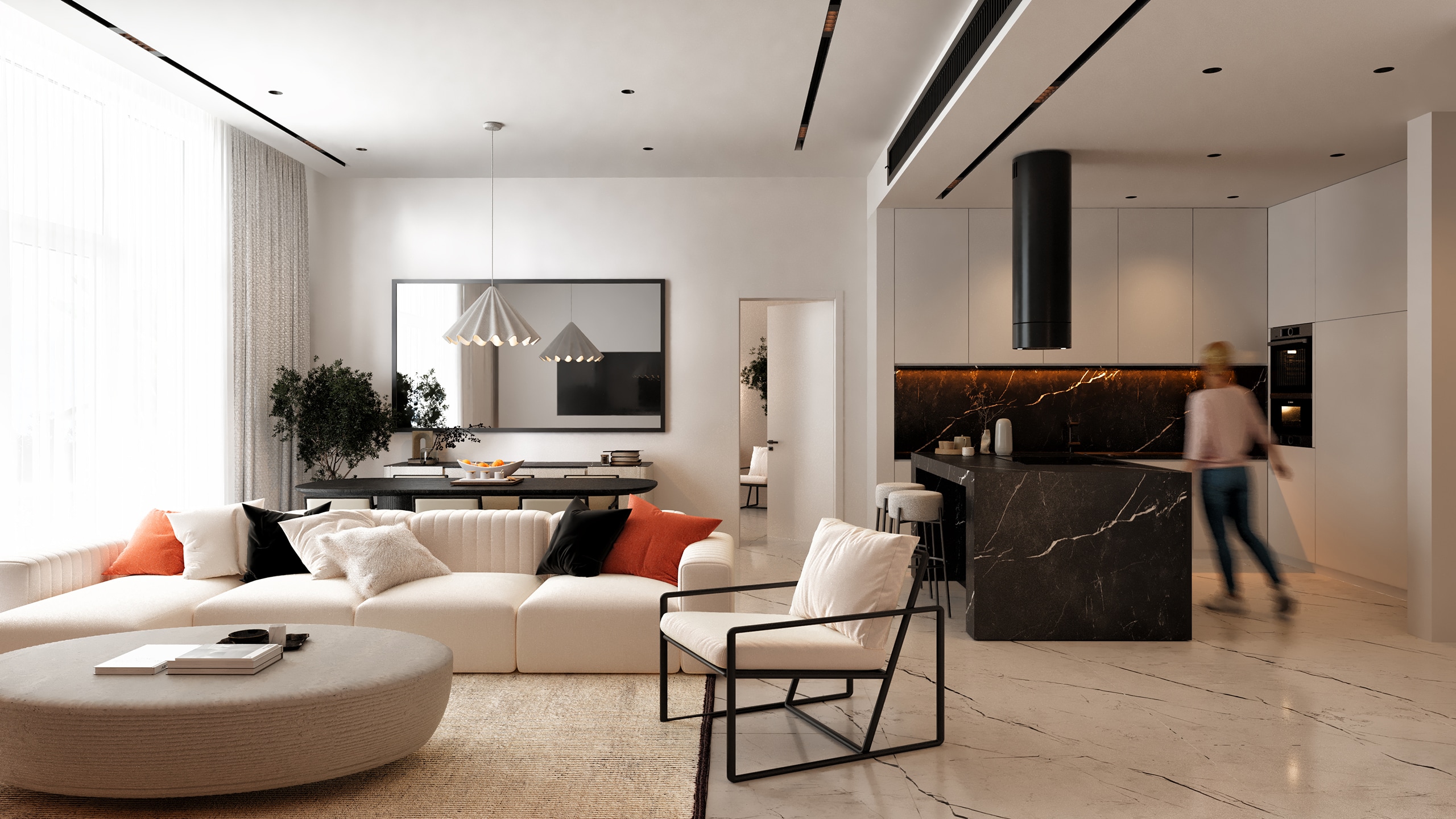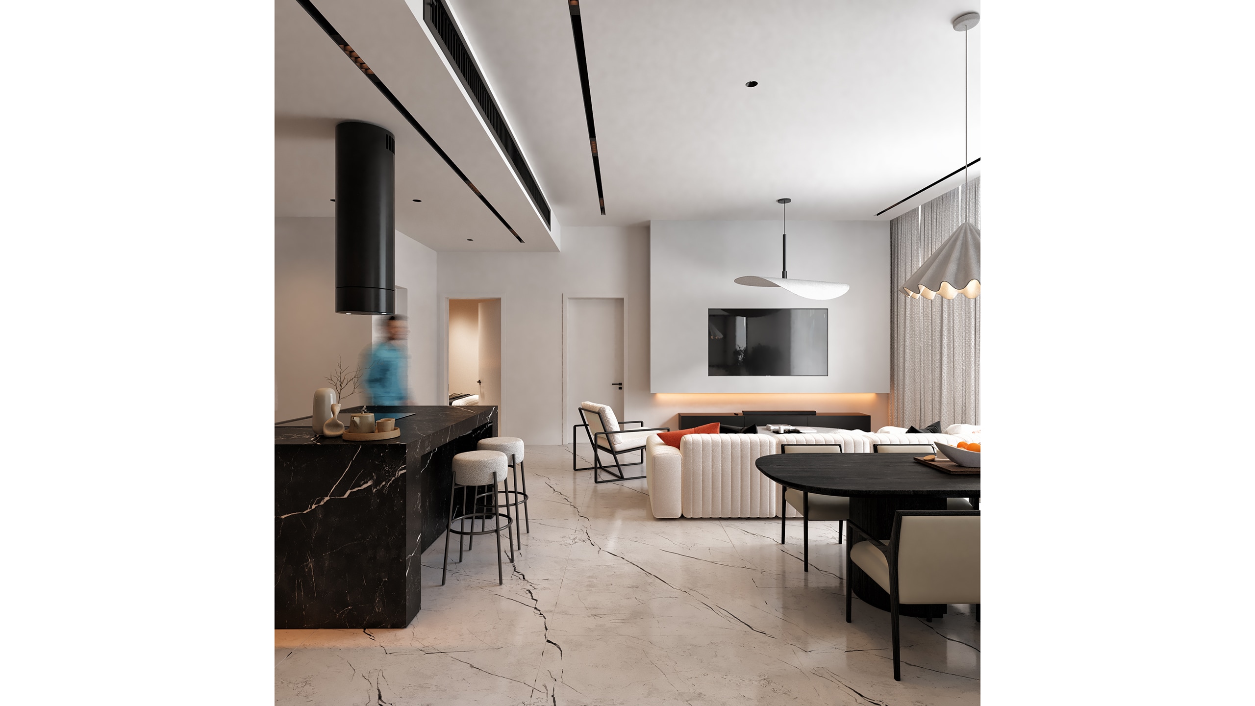 The interior design is driven by a black-and-white material narrative, with white surfaces forming a luminous base while black elements are applied with precision to create contrast and visual rhythm. Key surfaces such as the kitchen countertops and sink areas are crafted in black marble, bringing sculptural weight to the otherwise light and airy space.