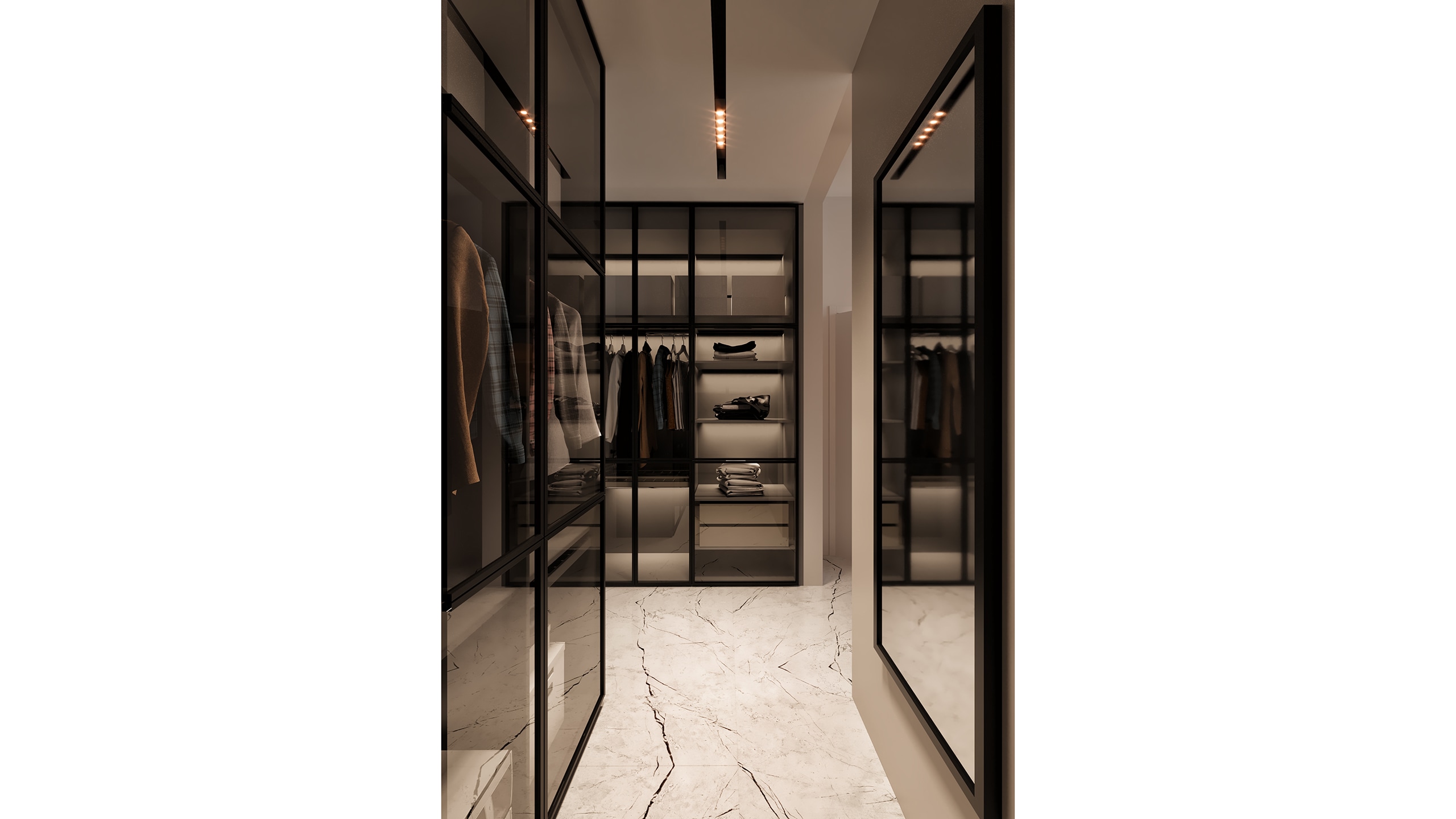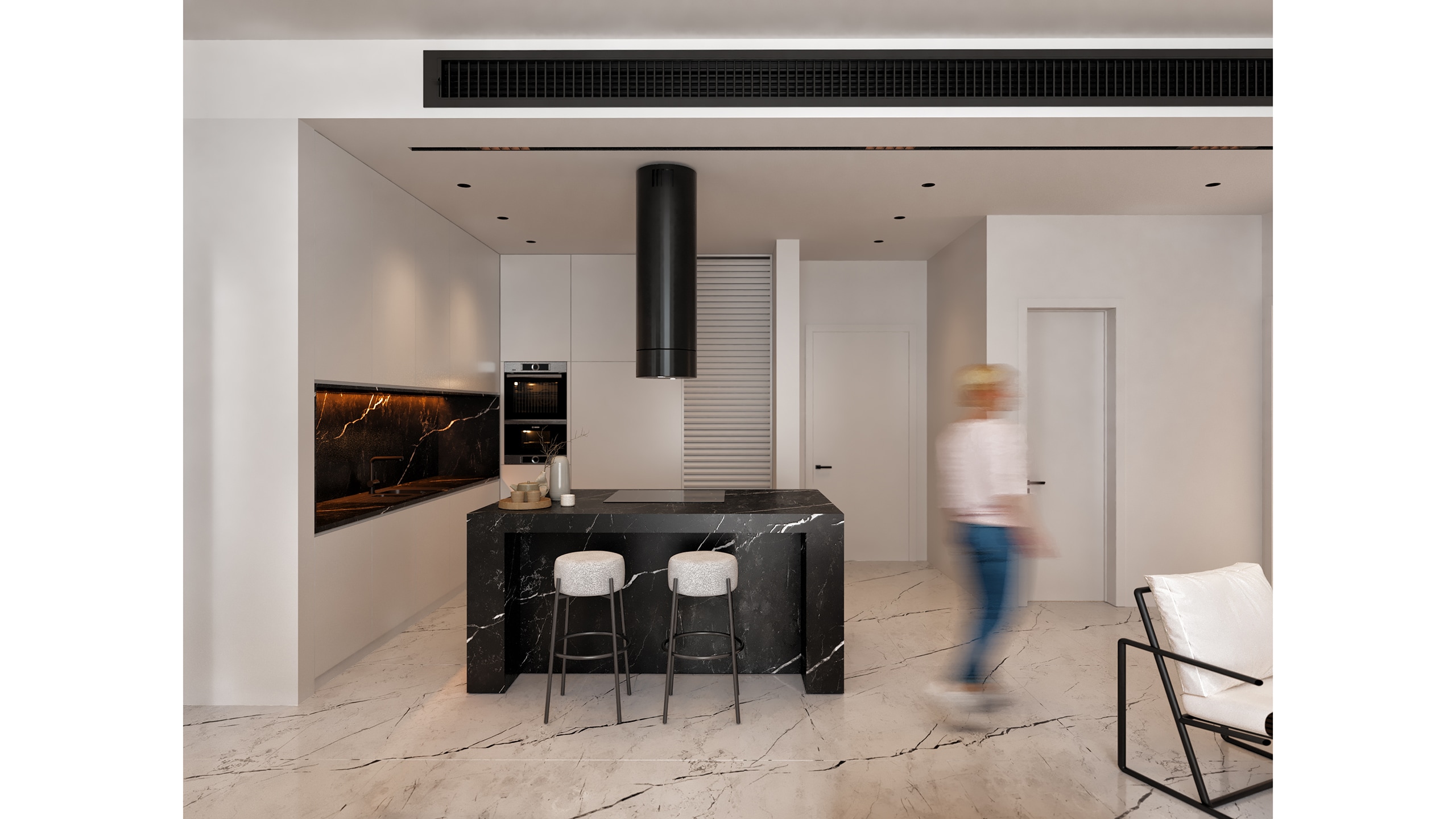 This monochromatic balance extends across the home, with selective black accents found in recessed lighting fixtures, ventilation grilles, and appliances - ensuring visual consistency without overloading the composition.