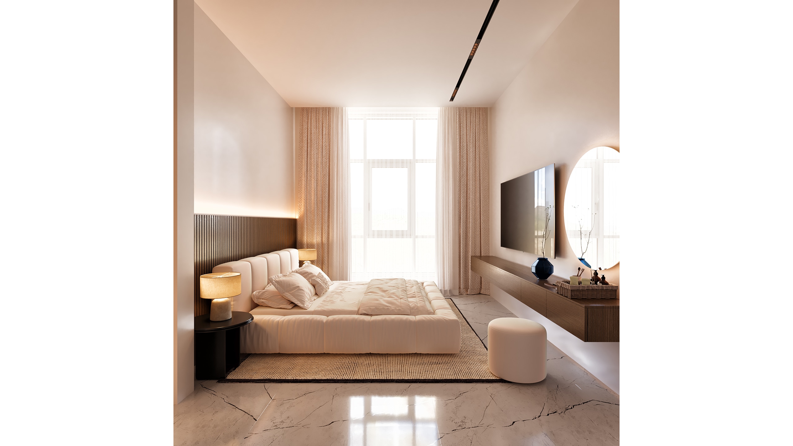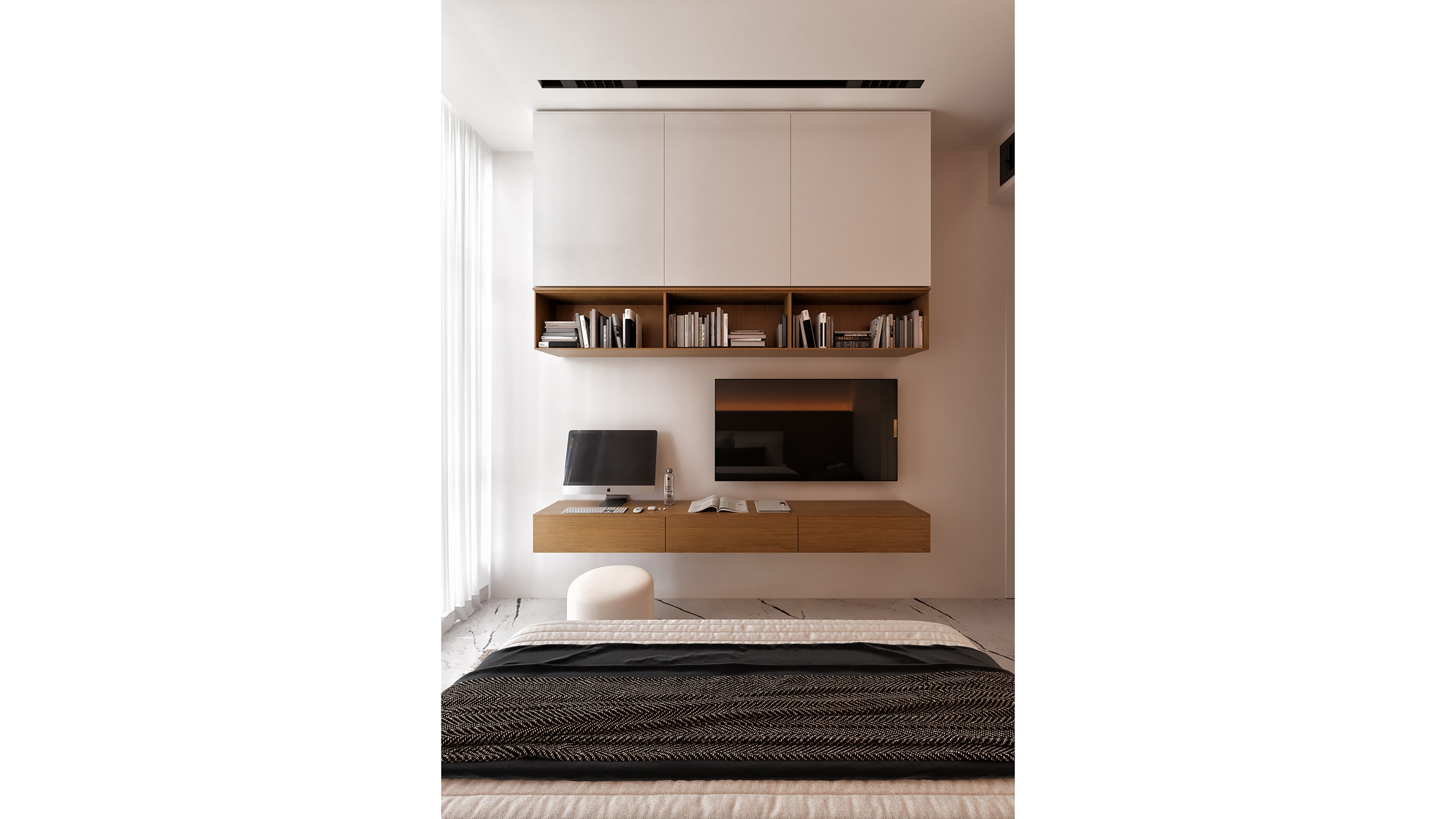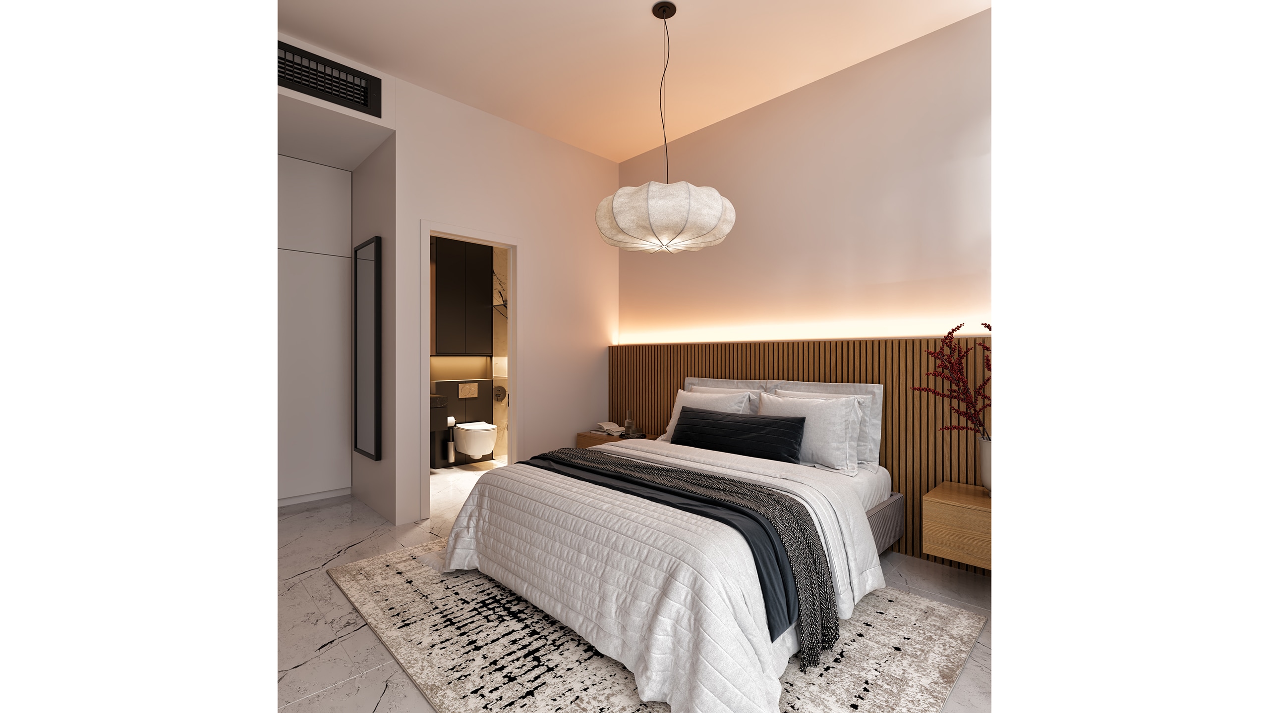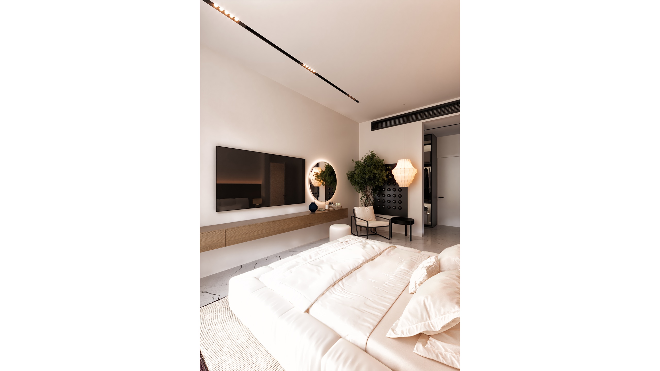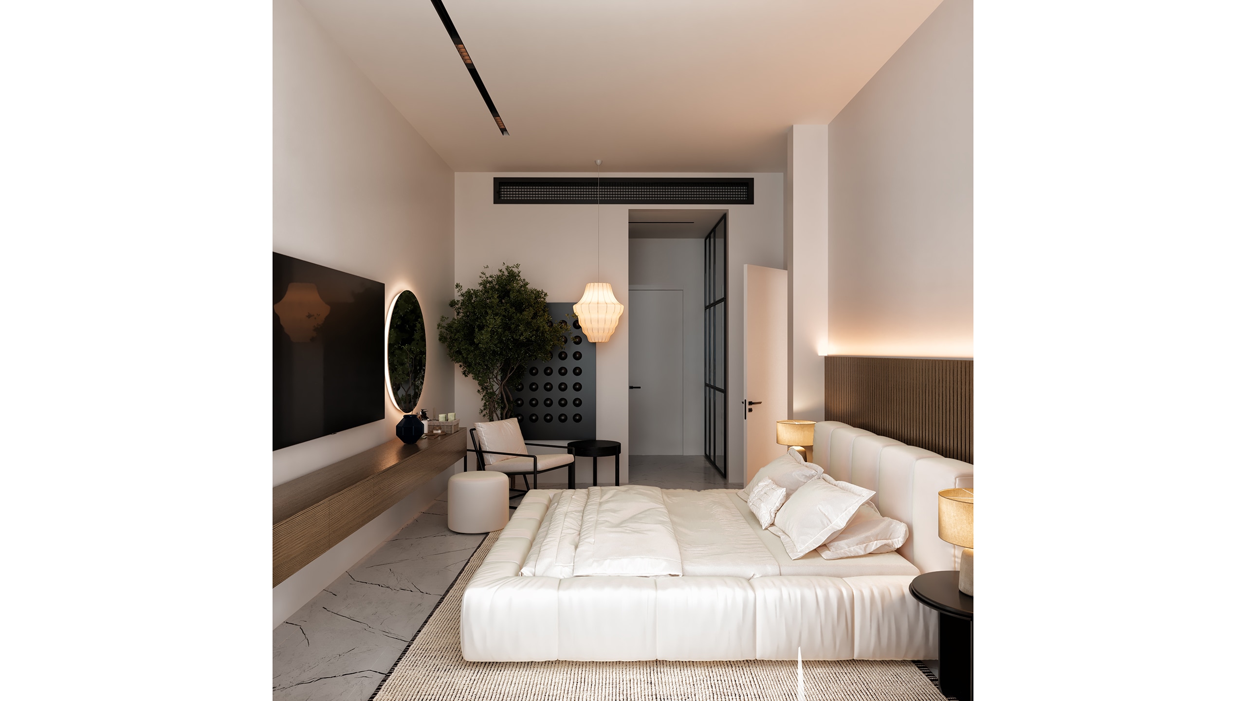 While the common areas emphasize contrast and sharp lines, the private spaces soften the palette without departing from the overall design ethos. In the bedrooms, natural wood tones are introduced in headboards and custom cabinetry, gently warming the space and bringing a tactile human quality to the otherwise minimalist environment.