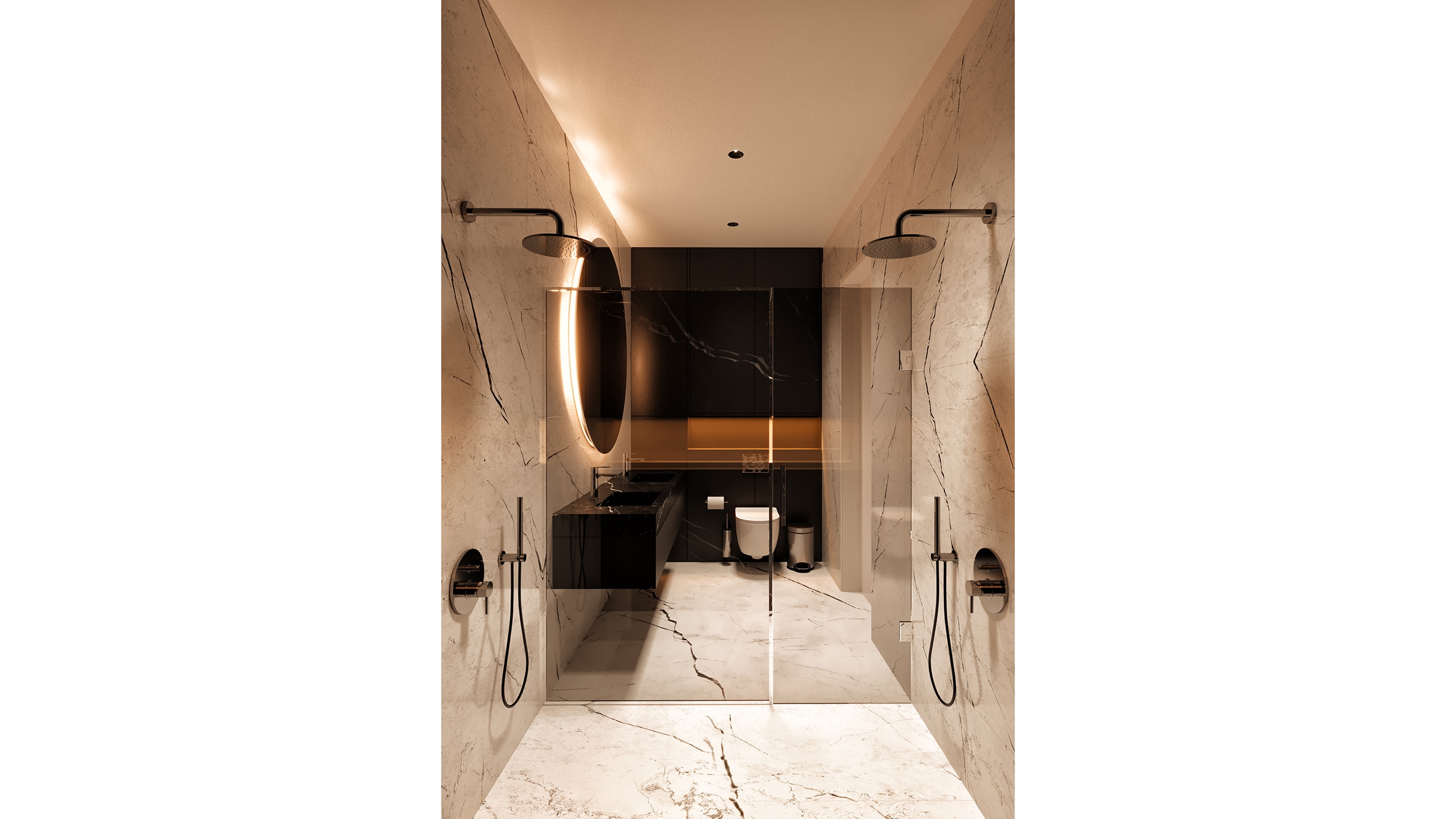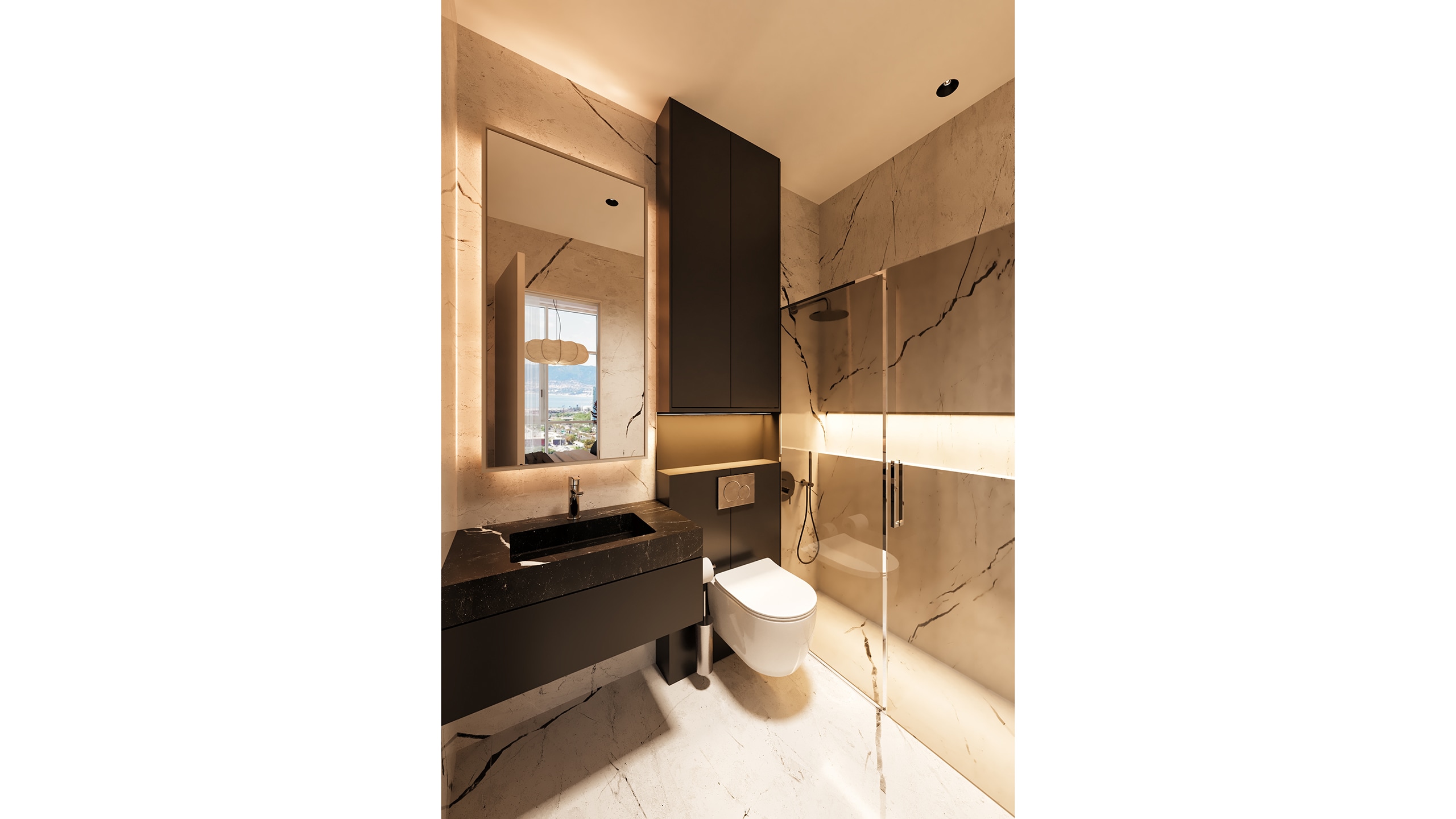 Beyond aesthetics, Y House incorporates a number of technical refinements that elevate the living experience. In the bathrooms, white marble is used to maintain clarity and continuity, while black stone surfaces are reserved for the shower enclosures and sinks, maintaining the established visual dialogue.